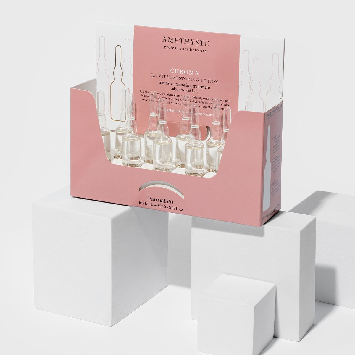 FarmaVita Amethyste Chroma Re-Vital Restoring Lotion 10x10ml is een intensief herstellende treatment speciaal voor gekleurd haar. De formule is verrijkt met Amino Acids + Lactic Acid + Glicoamine voor een dubbele werking: herstellend en kleurbeschermend. De verpakking bevat 10 ampullen van 10ml.