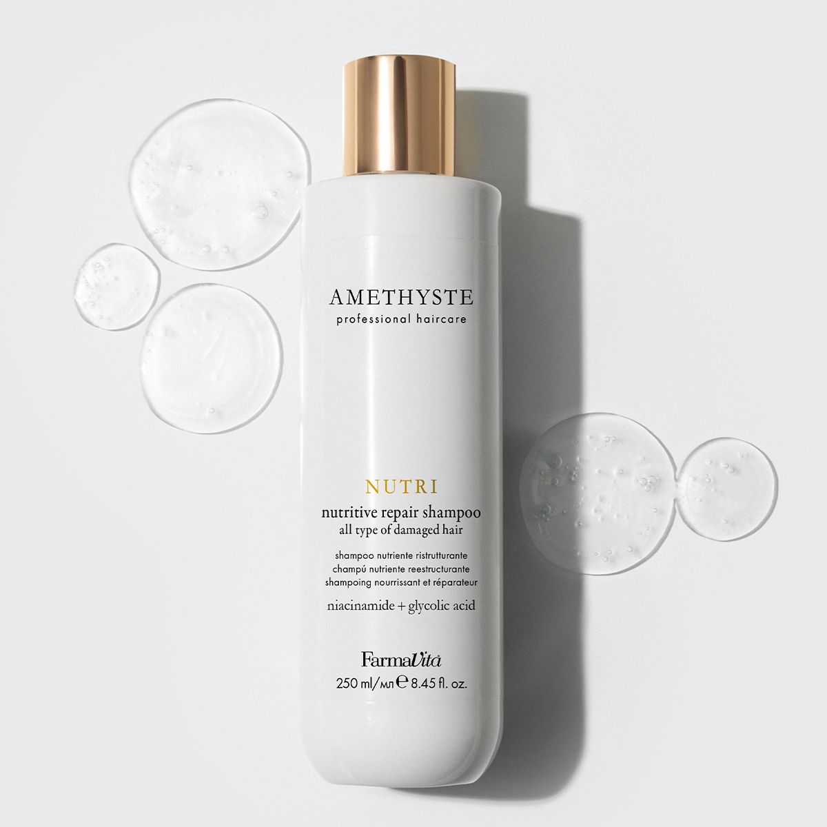 FarmaVita Amethyste Nutri Nutritive Repair Shampoo 250ml is een verzorgende en herstellende shampoo voor beschadigd haar. De shampoo is verrijkt met Niacinamide + Glycolic Acid om de haarstructuur te repareren en versterken, waardoor het haar weer zacht en glanzend wordt. FarmaVita Amethyste Nutri is geschikt om alle soorten droog en beschadigd haar te verstellen over de gehele lengtes tot in de puntjes.