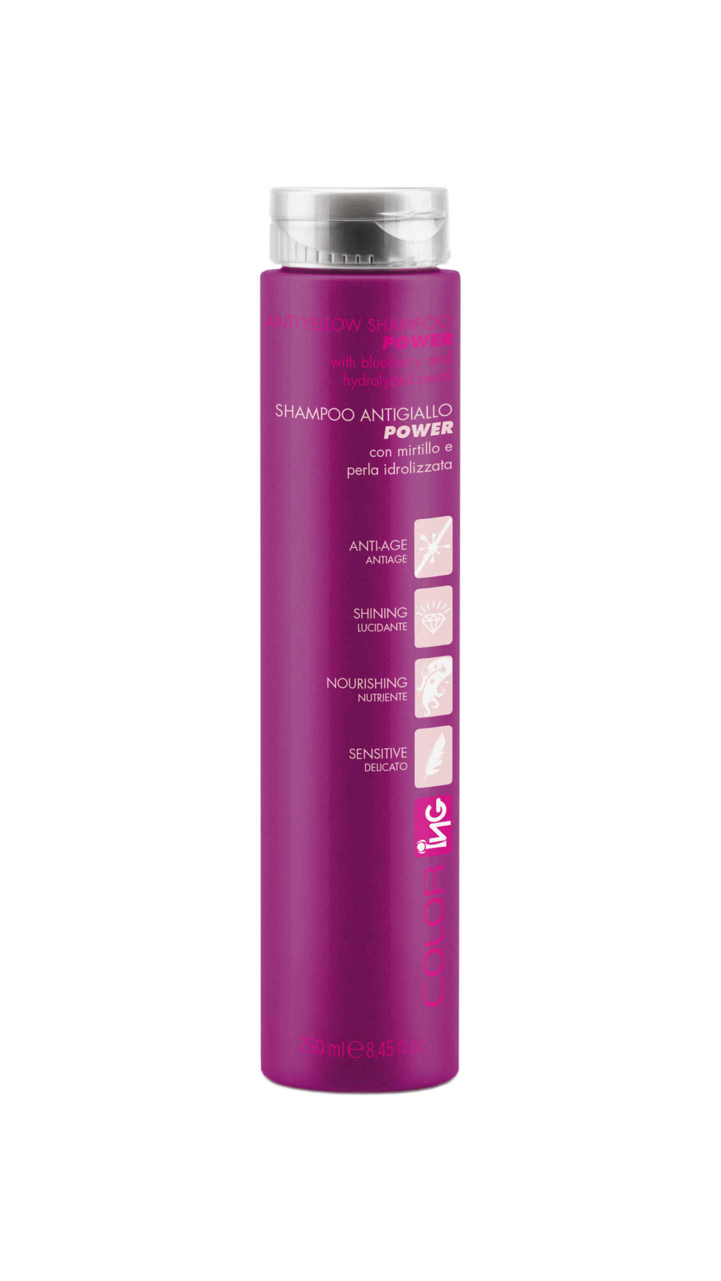 Color Ing Anti-Yellow Shampoo Power is een intensief werkende zilvershampoo, speciaal ontwikkeld voor blond, geblondeerd, grijs of wit haar. De krachtige paarse pigmenten neutraliseren direct warme, gele ondertonen en geven het haar een koele, frisse uitstraling – al na één wasbeurt.