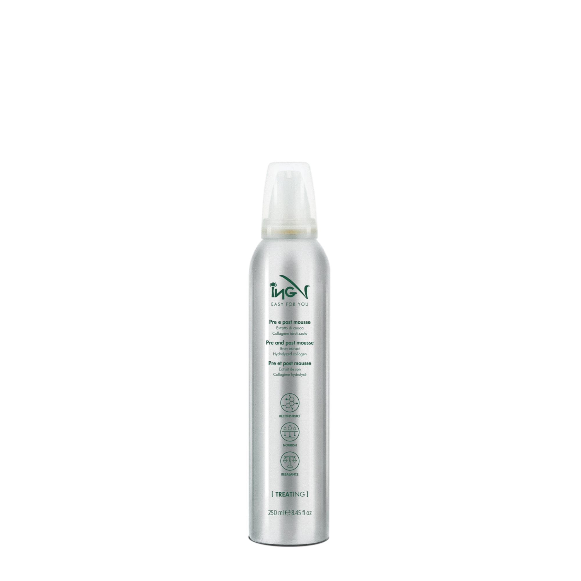Treat-Ing Pre and Post Mousse is een intensief verzorgende mousse die het haar beschermt vóór én kalmeert na chemische behandelingen zoals kleuren, ontkleuren of permanenten. De luchtige formule helpt de haarvezel te stabiliseren en de pH-waarde van haar en hoofdhuid in balans te brengen.