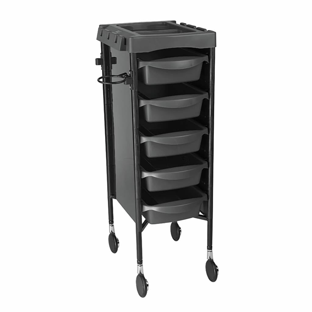 Milano werkwagen van Sibel heeft een föhnhouder en 5 boxen met vakverdeling. De boxen kun je tevens aan de zijkant ophangen. De grote rubberen wielen zorgen dat je de werkwagen makkelijk kunt verrijden.